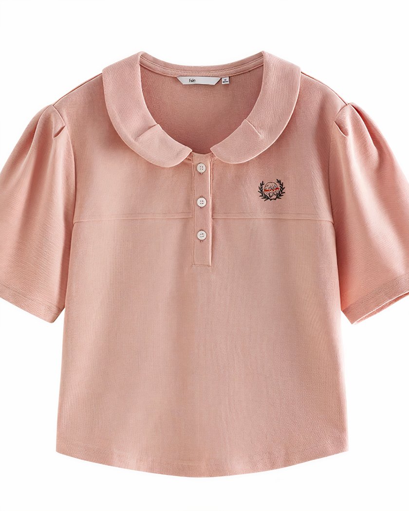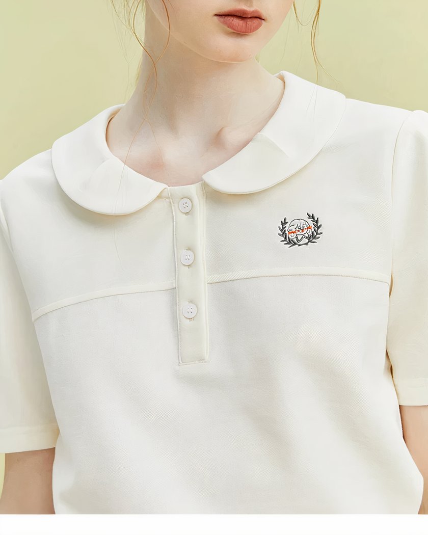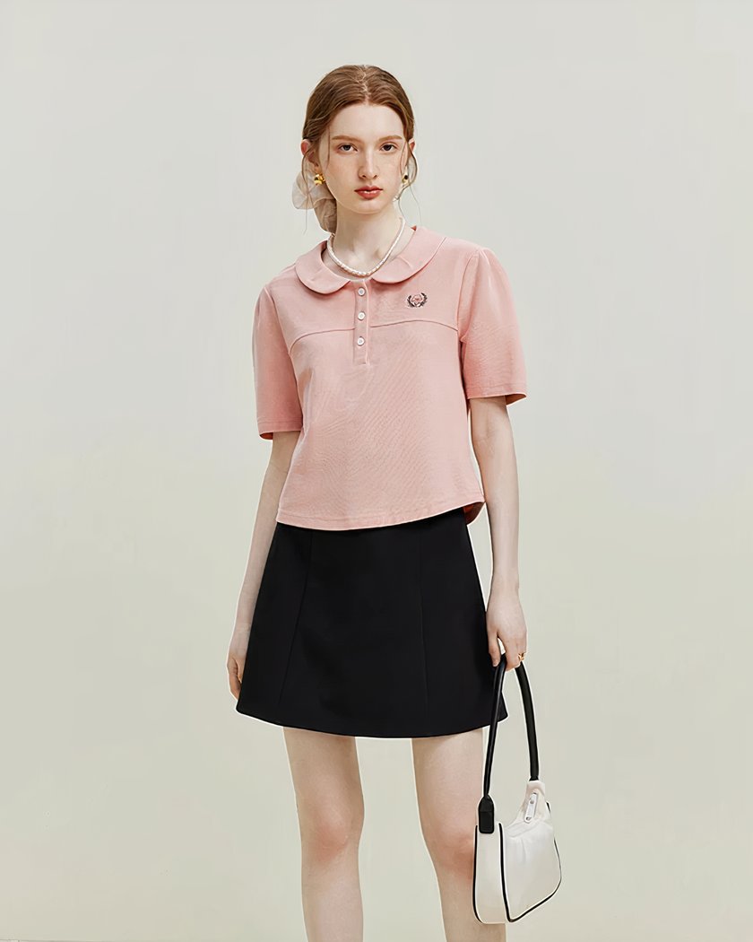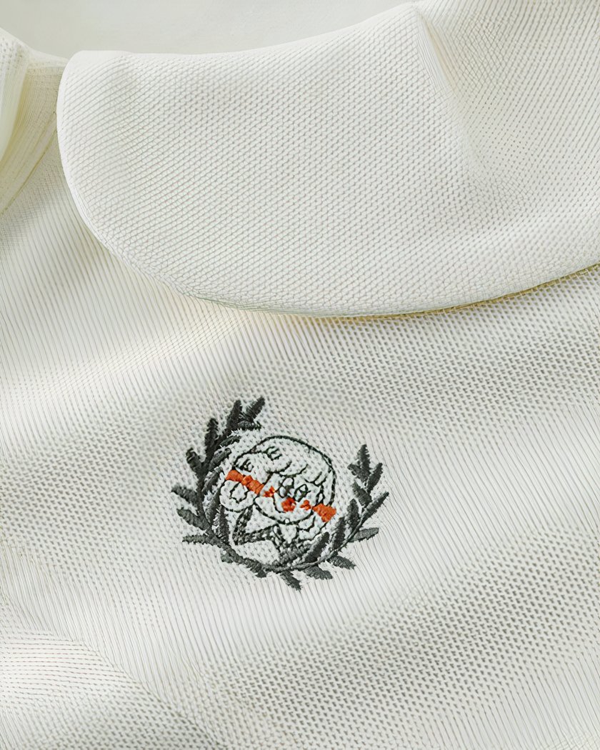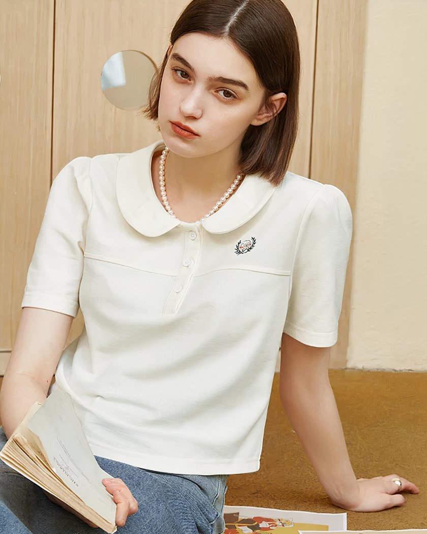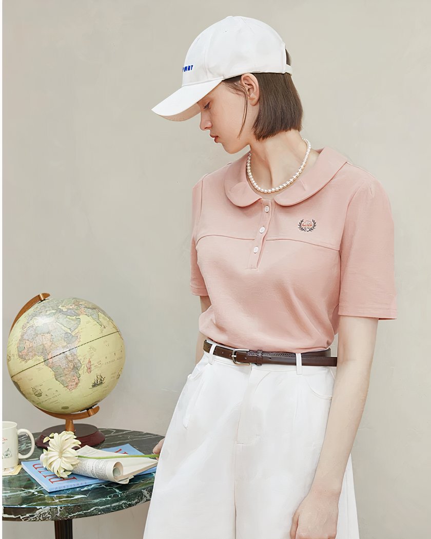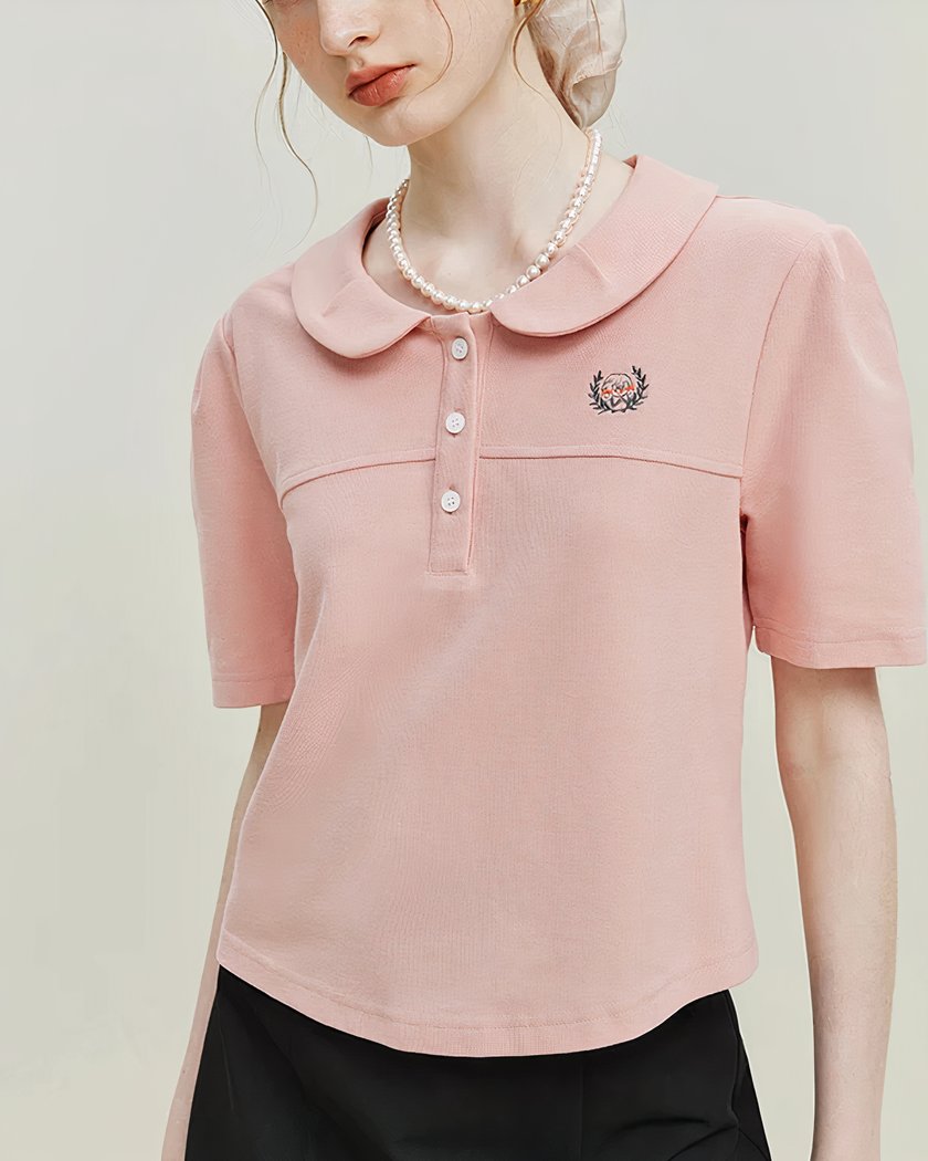 Ce polo femme chic col Claudine est doté d'un design court et légèrement évasé orné d'une petite broderie représentant une tête d'enfant sur un col polo entourée d'une couronne de lauriers. Très charmant et romantique, ce polo chic est proposé en deux couleurs douces qui s'harmonisent parfaitement à son look en renforçant l'impression de douceur qu'il dégage.