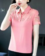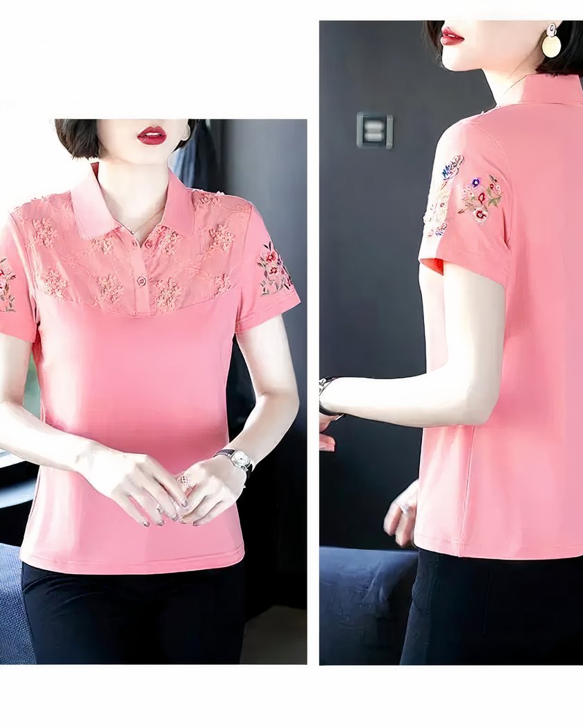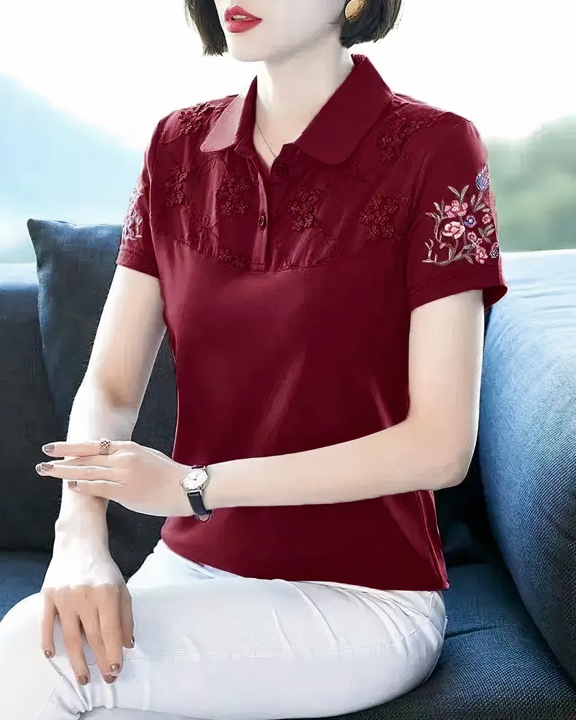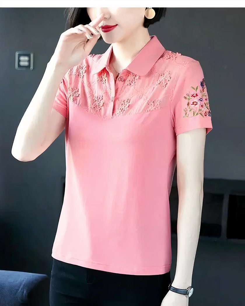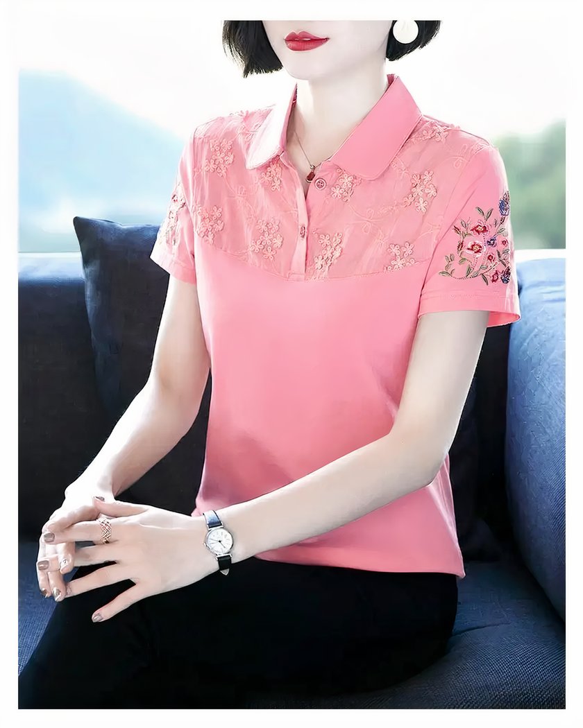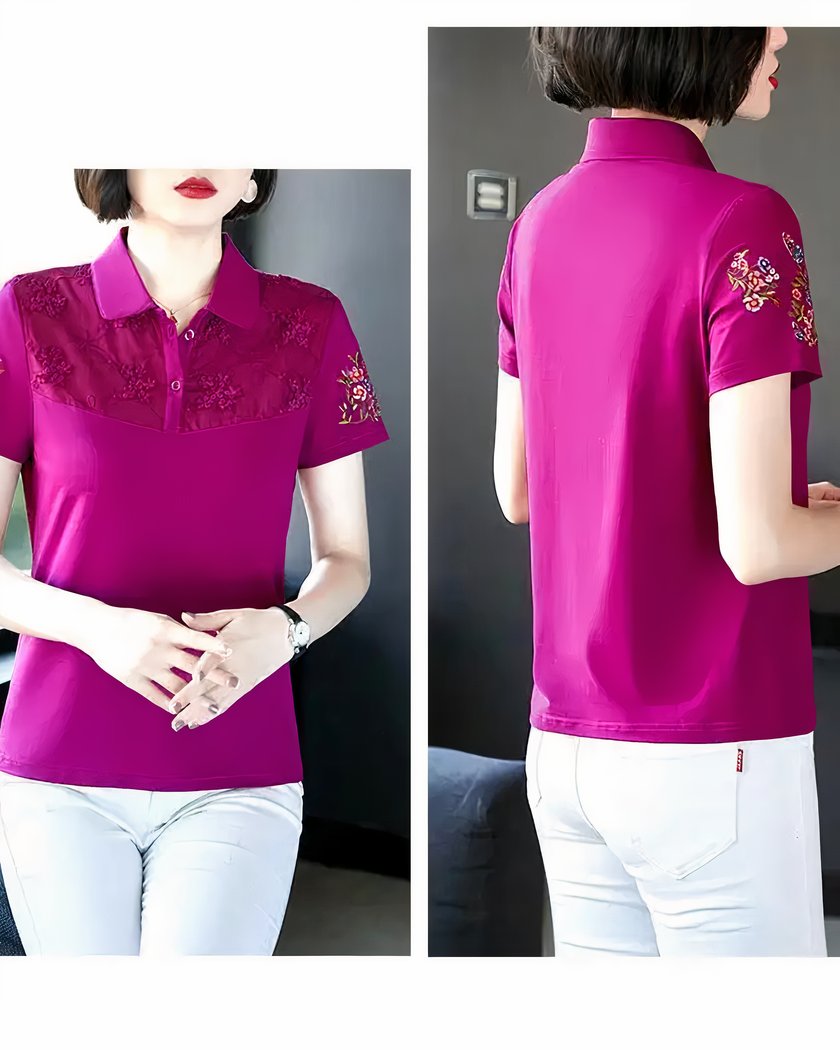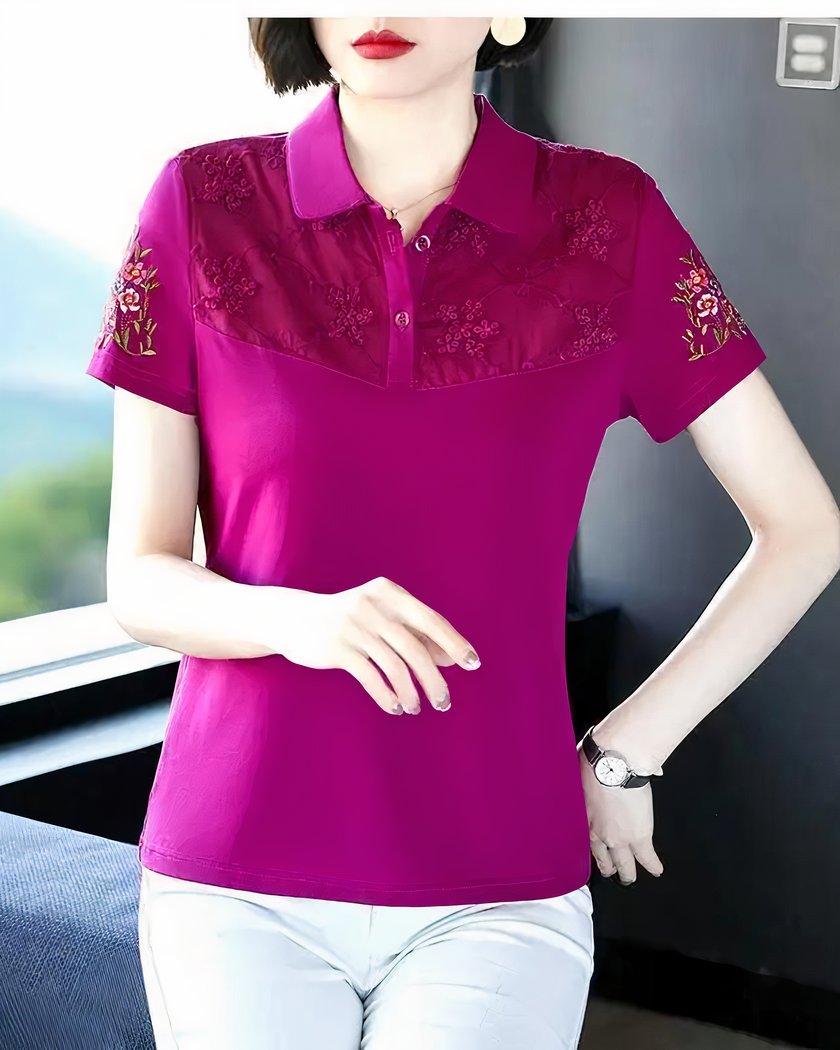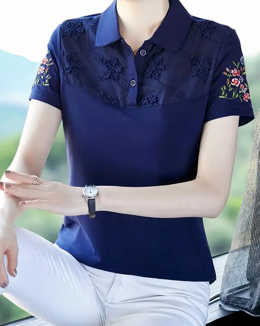 Ce polo femme chic empiècement brodé fleurs a été conçu en coton, tissu idéal pour l'été : sa douceur et le confort qu'il apporte ne sont plus à démontrer et vous permettront de le porter toute la journée même par canicule. Ce produit à la coupe droite et au léger stretch est doté d'un empiècement du haut des épaules jusqu'à mi poitrine dont l'effet chic est assuré.