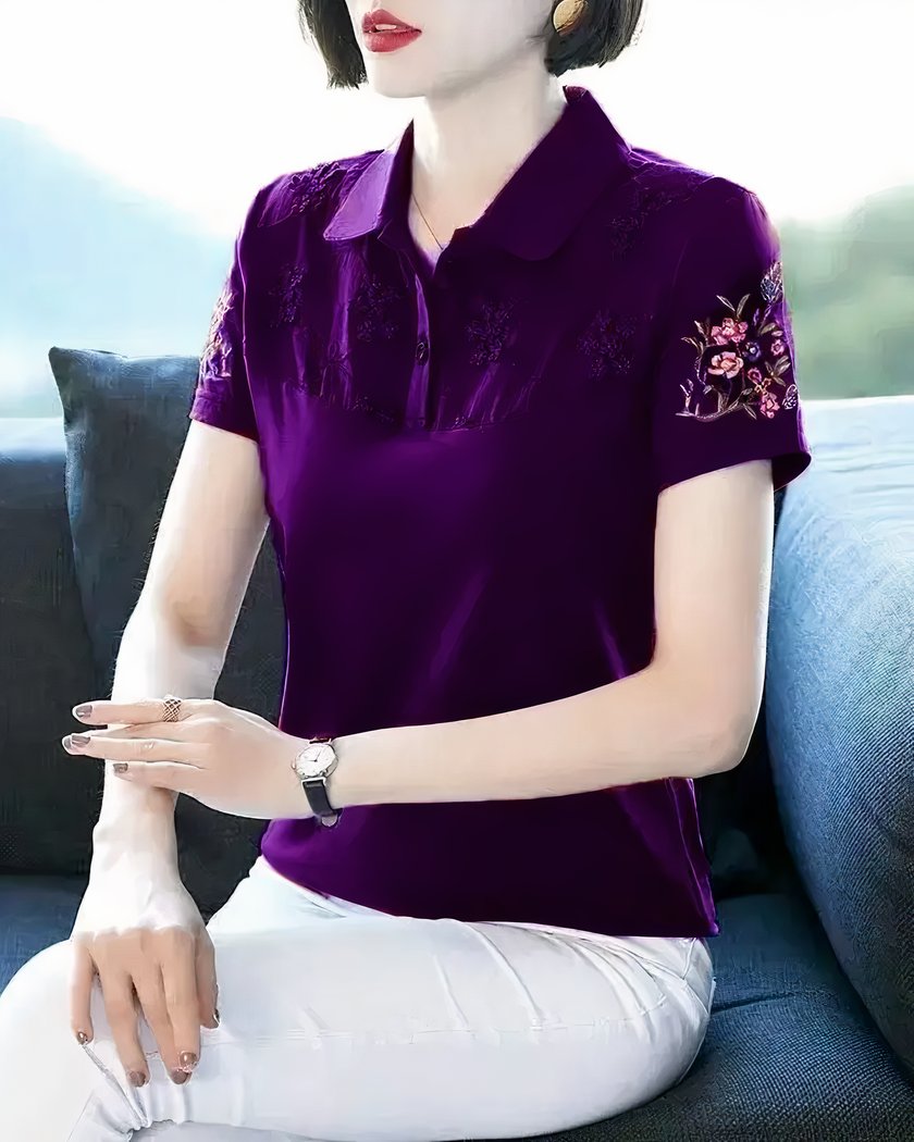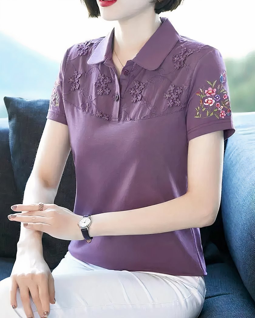 Ce polo femme chic empiècement brodé fleurs comporte une broderie en relief 3D sur l'empiècement : cette broderie ton sur ton représente des fleurs en forme de flocon. Sur les manches, on trouve une broderie colorée de jolies fleurs ressemblant à des pensées. Les six couleurs que nous vous proposons sont parfaitement raccord avec le style du polo et renforcent son look rétro chic.