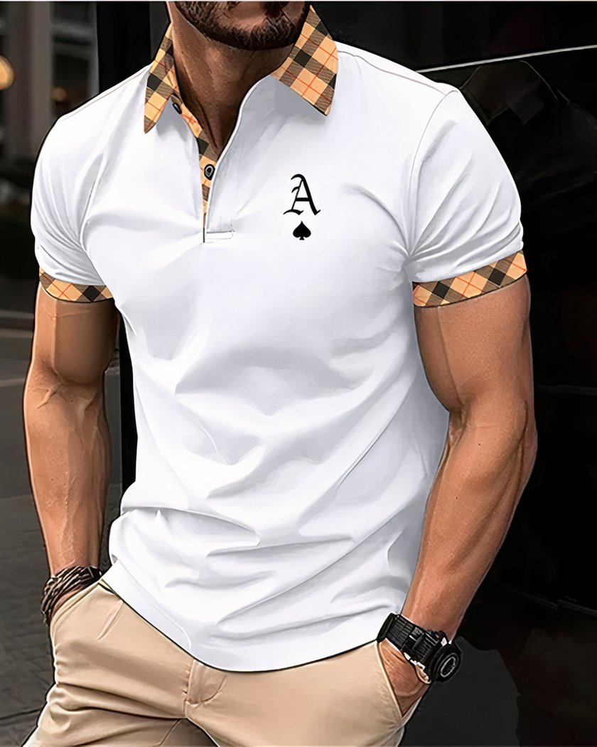 Ce polo de golf détails à carreaux pour homme est très élégant avec le motif carreaux au col, dans la patte de boutonnage et aux manches. Cela lui donne un petit côté anglais pas désagréable et très chic. De plus, une lettre A apposée côté coeur avec un pique juste en dessous apporte une touche supplémentaire de glamour.