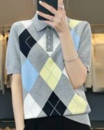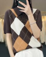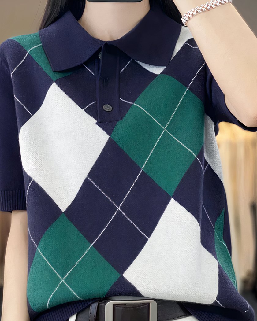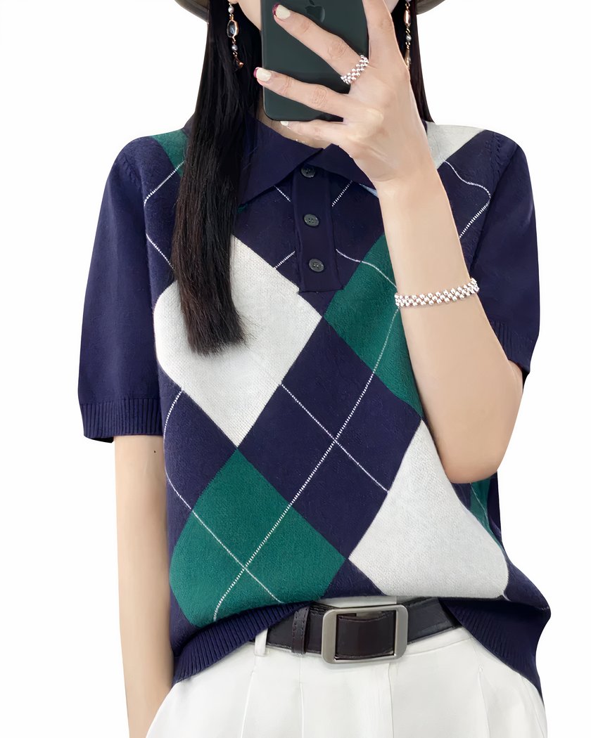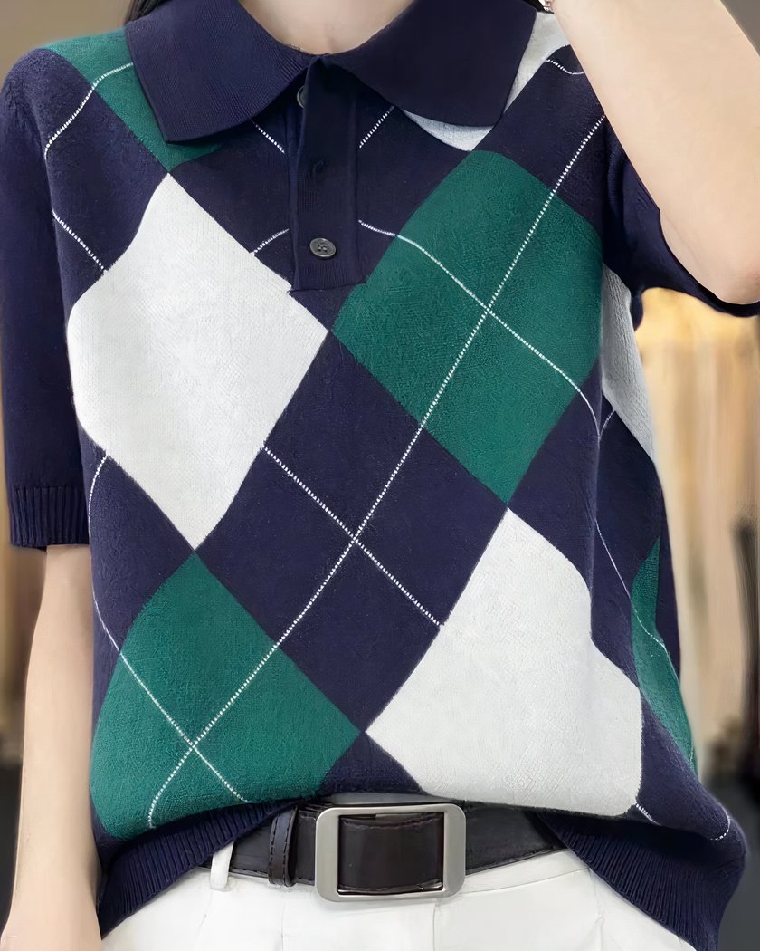 Polo à manches courtes pour femme, tricot à losanges
