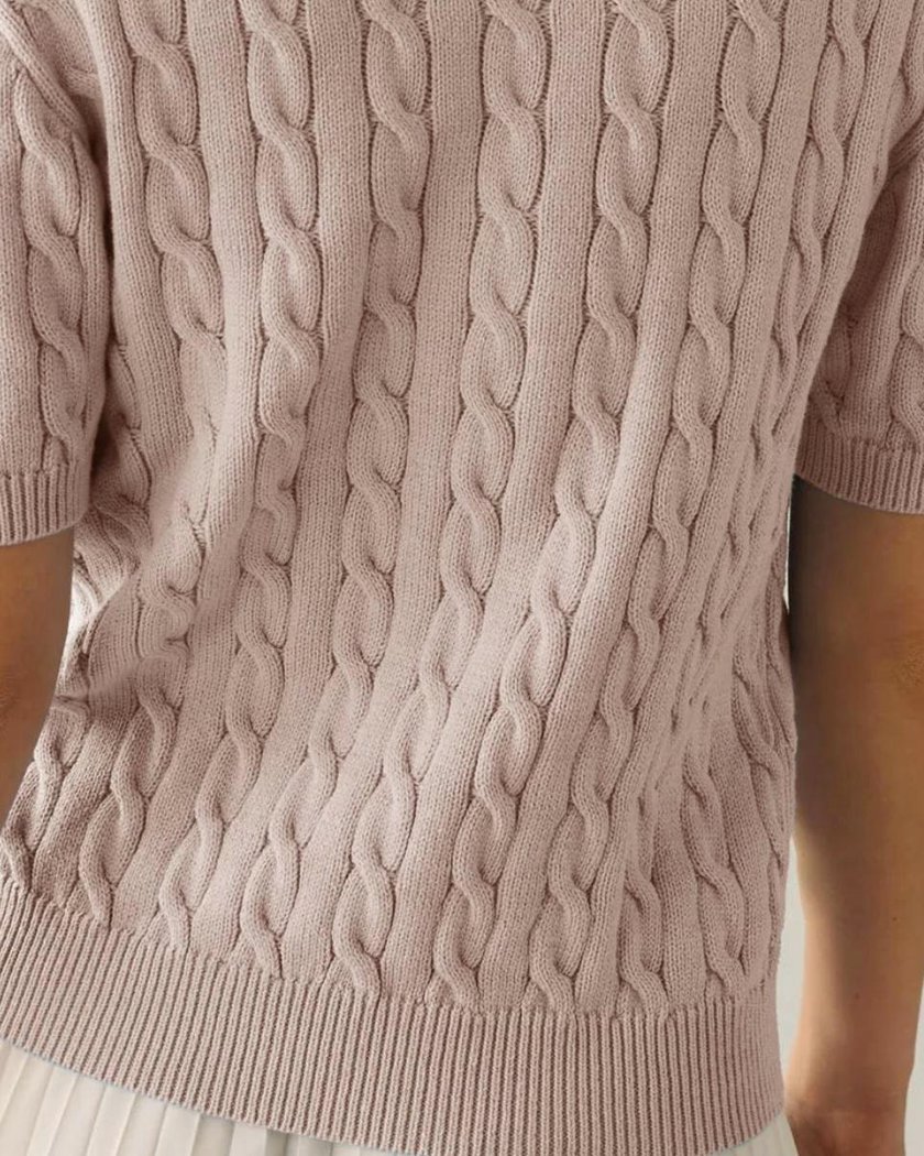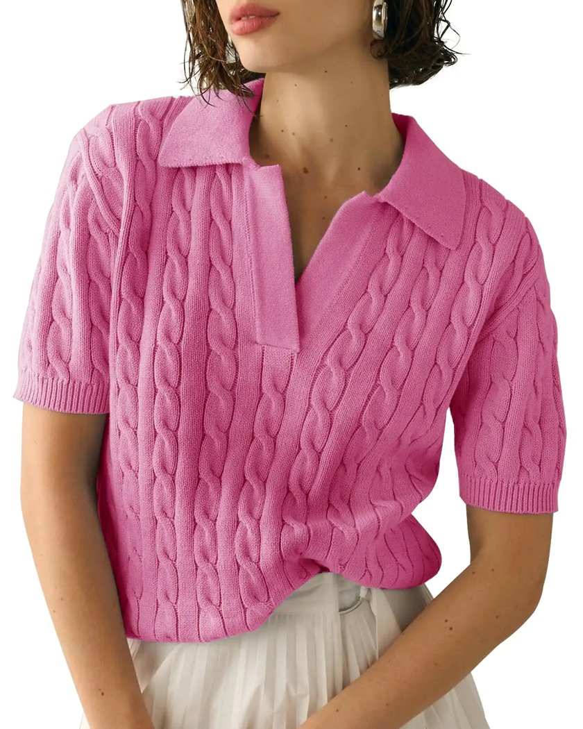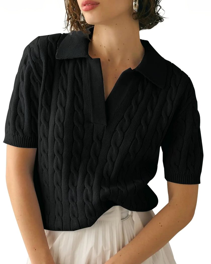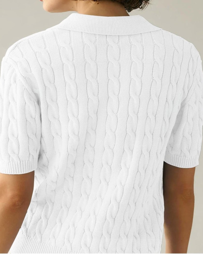 Ce motif torsadé ajoute une touche de sophistication et d'originalité à ce polo en tricot classique, tandis que les manches courtes le rendent parfait pour être porté seul ou superposé sous une veste ou un manteau. Sa coupe ajustée mettra en valeur votre silhouette tout en vous permettant de bouger librement.