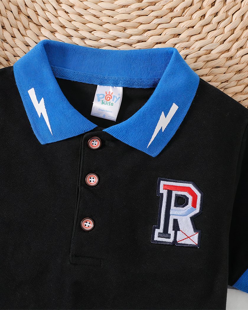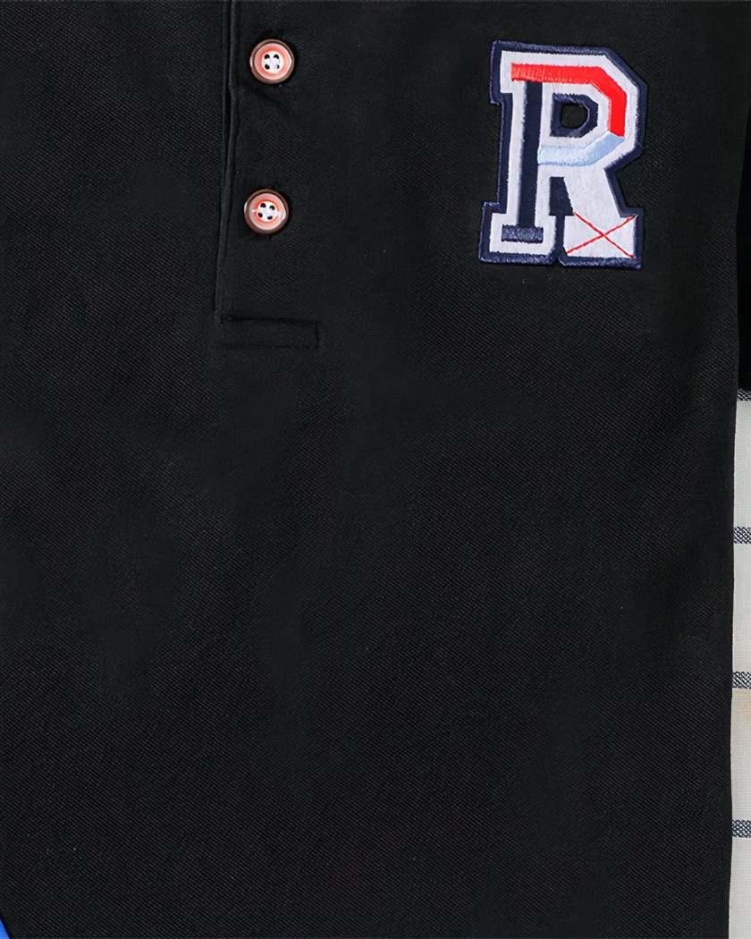 Notre polo à manches courtes de rugby noir arbore un écusson avec une lettre "R" imprimé sur la poitrine qui renforce l'esprit d'appartenance au rugby tout en apportant une note d'authenticité à ce vêtement. Ses éclairs blancs distinctifs brodés sur un col bleu turquoise apportent également une touche que seul votre enfant possèdera.