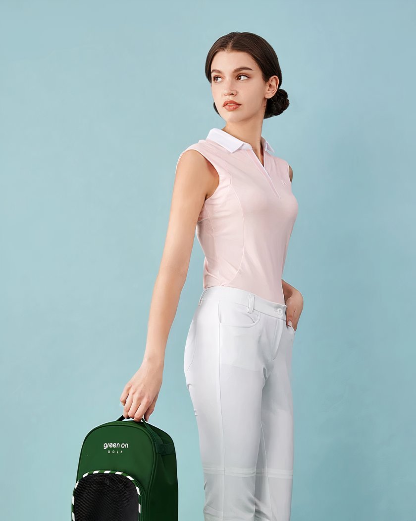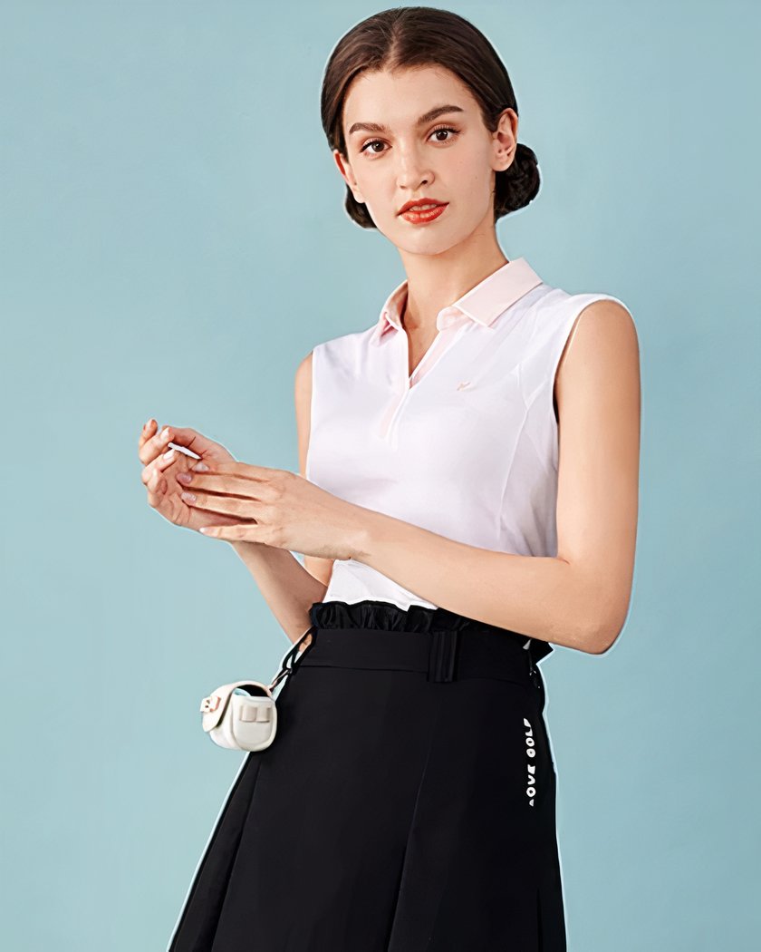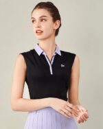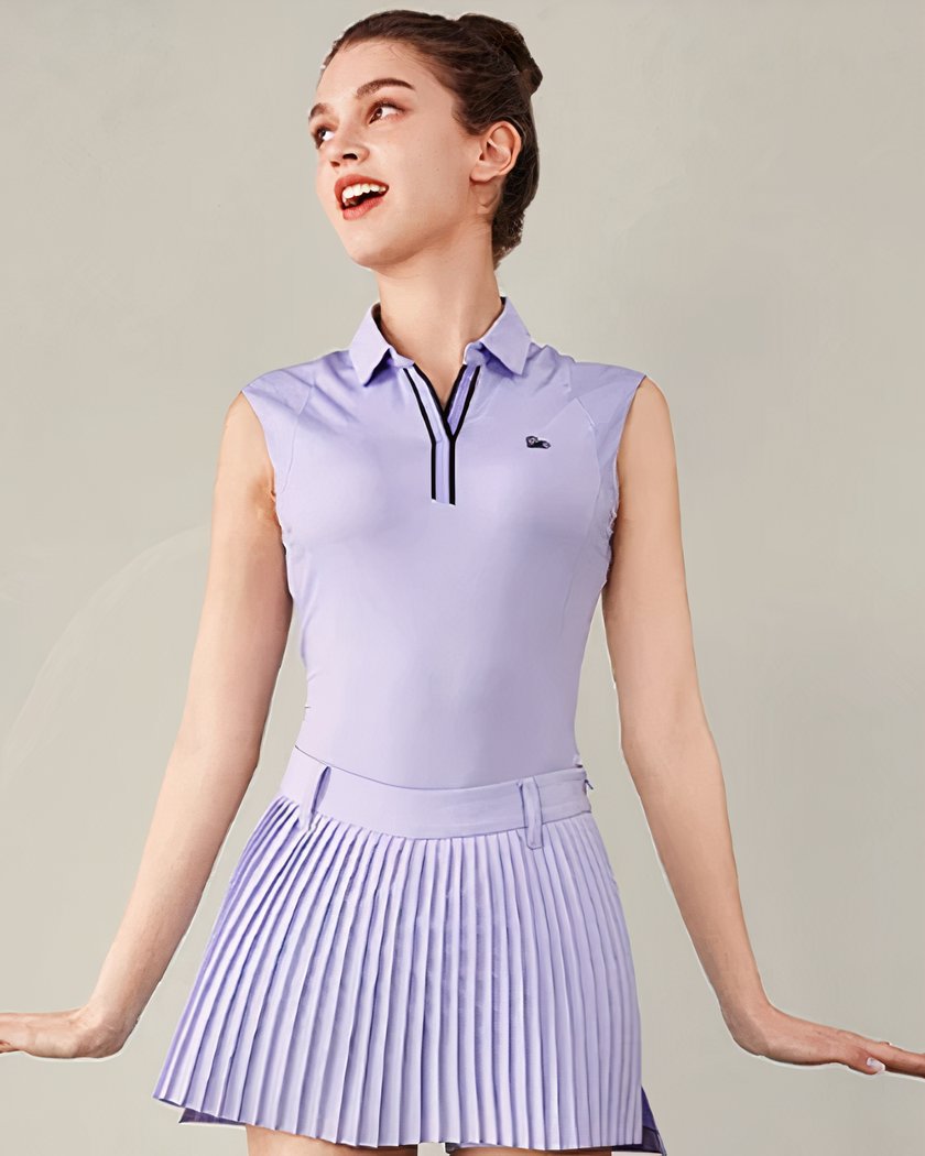 Notre polo sans manches respirant pour femme est un polo pour le sport aux propriétés hautement élastiques et au look très élégant. Il possède la particularité d'être sans boutonnage, il est doté de la patte double sans boutonnière, cousue sur la partie basse puis formant un petit décolleté en V d'une couleur différente du polo sauf sur le modèle violet où ce sont juste les bords de la patte. Le col fait de même.