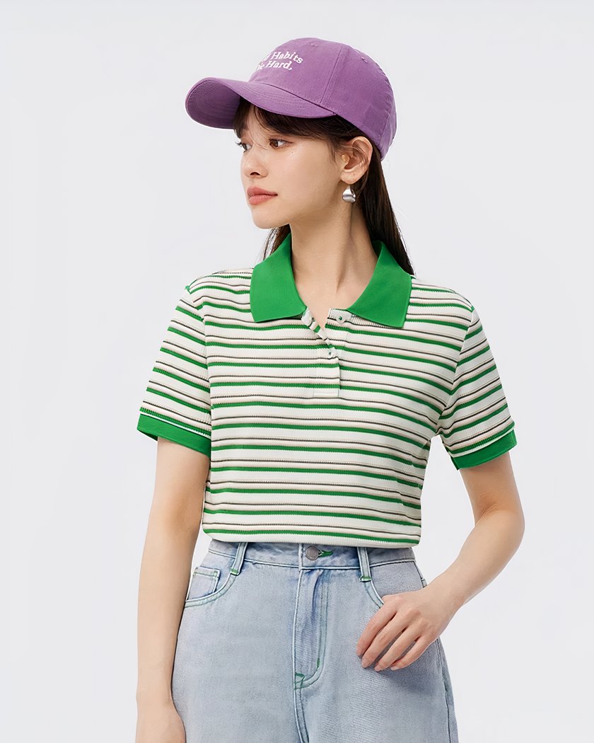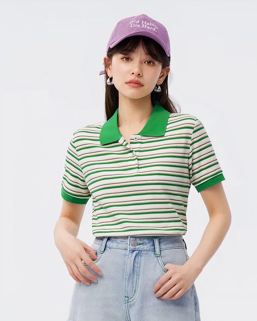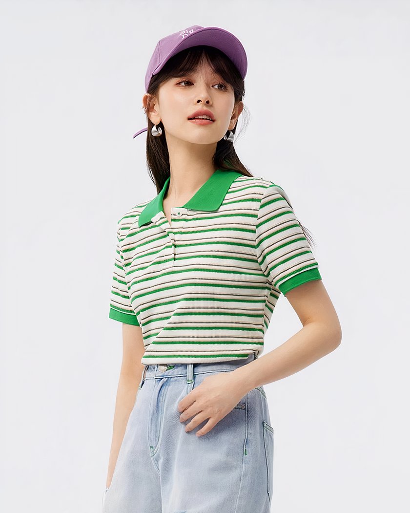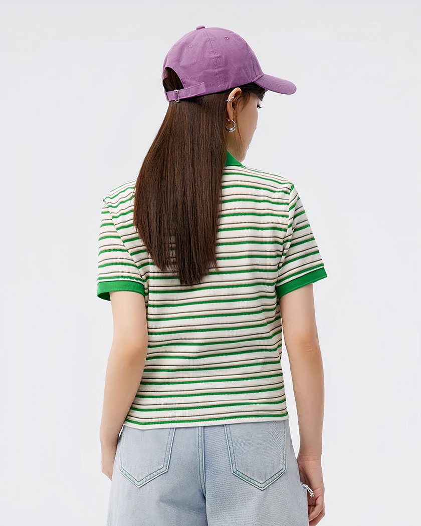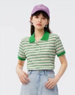 Le col et le bord des manches de notre polo vintage rayé en tricot pour femme sont de la même couleur que les rayures. Pour notre modèle à rayures noires et blanches, le col et les rebord des manches sont noir et pour notre modèle à rayures vert et beige, ils sont vert. Le tricot est légèrement texturé ce qui offre un joli effet visuel mais également permet au tissu d'être extensible et donc très confortable.
