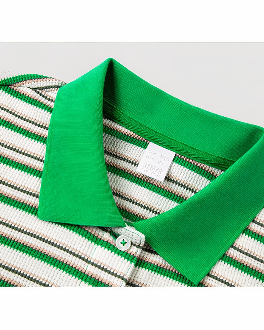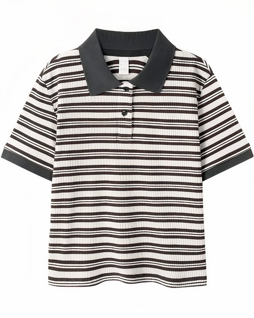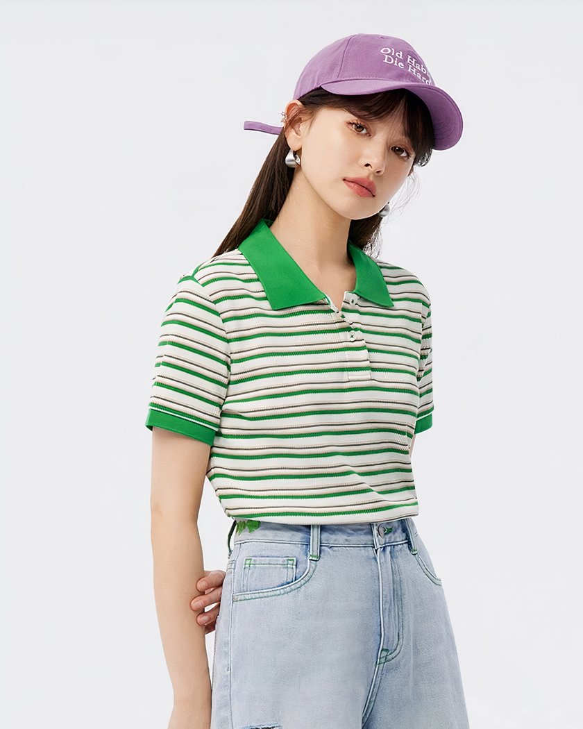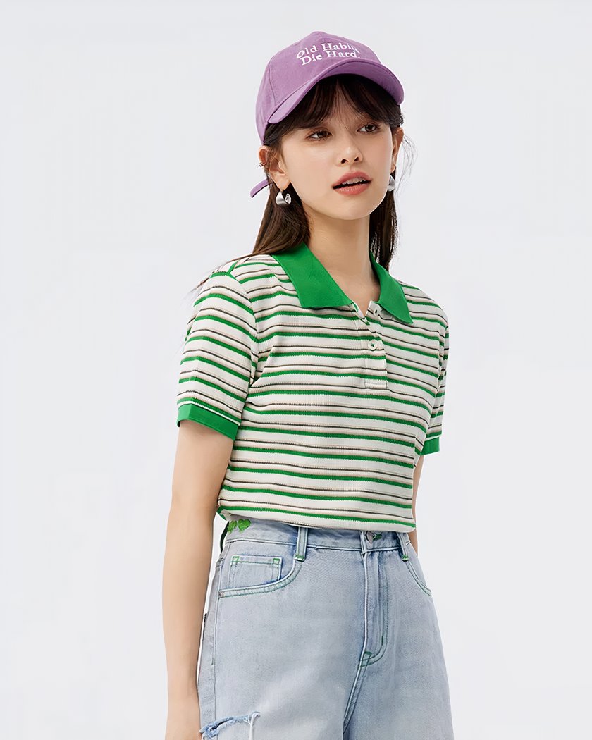 Le col et le bord des manches de notre polo vintage rayé en tricot pour femme sont de la même couleur que les rayures. Pour notre modèle à rayures noires et blanches, le col et les rebord des manches sont noir et pour notre modèle à rayures vert et beige, ils sont vert. Le tricot est légèrement texturé ce qui offre un joli effet visuel mais également permet au tissu d'être extensible et donc très confortable.