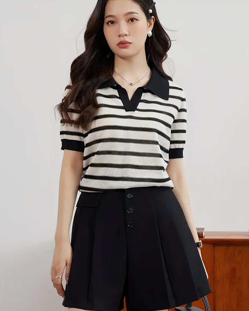 Notre polo vintage rayé en tricot sans boutons pour femme est un véritable incontournable à avoir dans votre garde robe pour un look rétro et élégant. Les rayures horizontales tricoté ajoute une texture et une dimension à la silhouette. Le col sans bouton apporte une touche à la fois décontractée et élégante et les manches courtes assez longues finissent parfaitement l'ensemble pour être à la fois raffiné avec un esprit rétro.