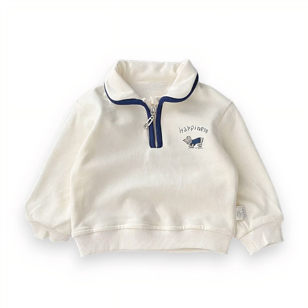 Le col arrondi souligné d’un liseré contrasté et la petite broderie du chien ajoutent une touche ludique et mignonne qui font craquer les parents.
